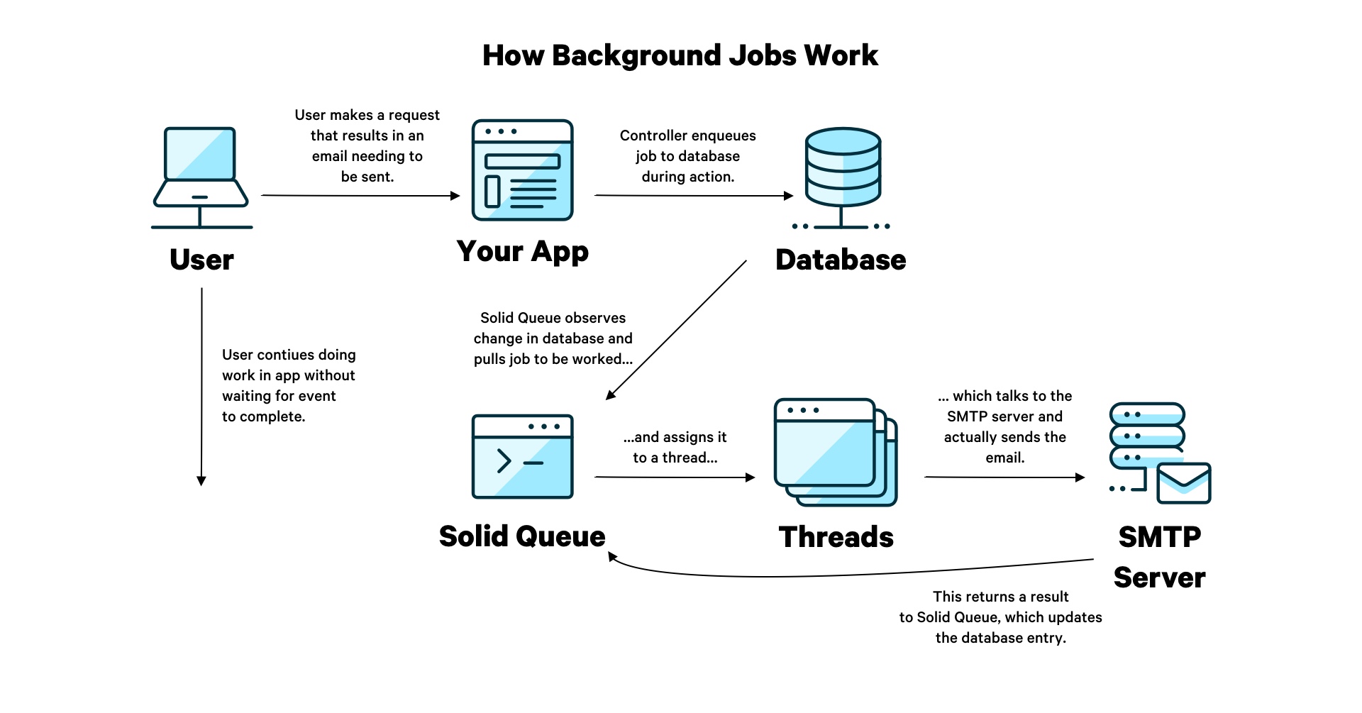 Background jobs allow you to run tasks asynchronously behind-the-scenes in a separate process, preventing them from interrupting the user experience. Imagine sending in stock emails to 10,000 recipients. It could take a while, so we can offload that task to a background job to keep the Rails app responsive.
